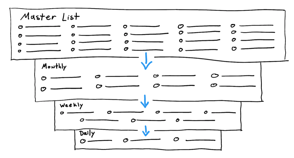 - Capture everything in a master list, then break it down by monthly, weekly, and daily goals.
